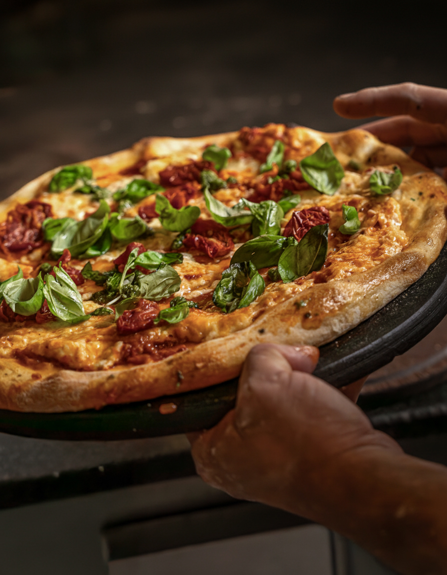 Commercial food photography capturing the charred crust, vibrant basil, and melted textures of an artisanal pizza in a moody, rustic setting.