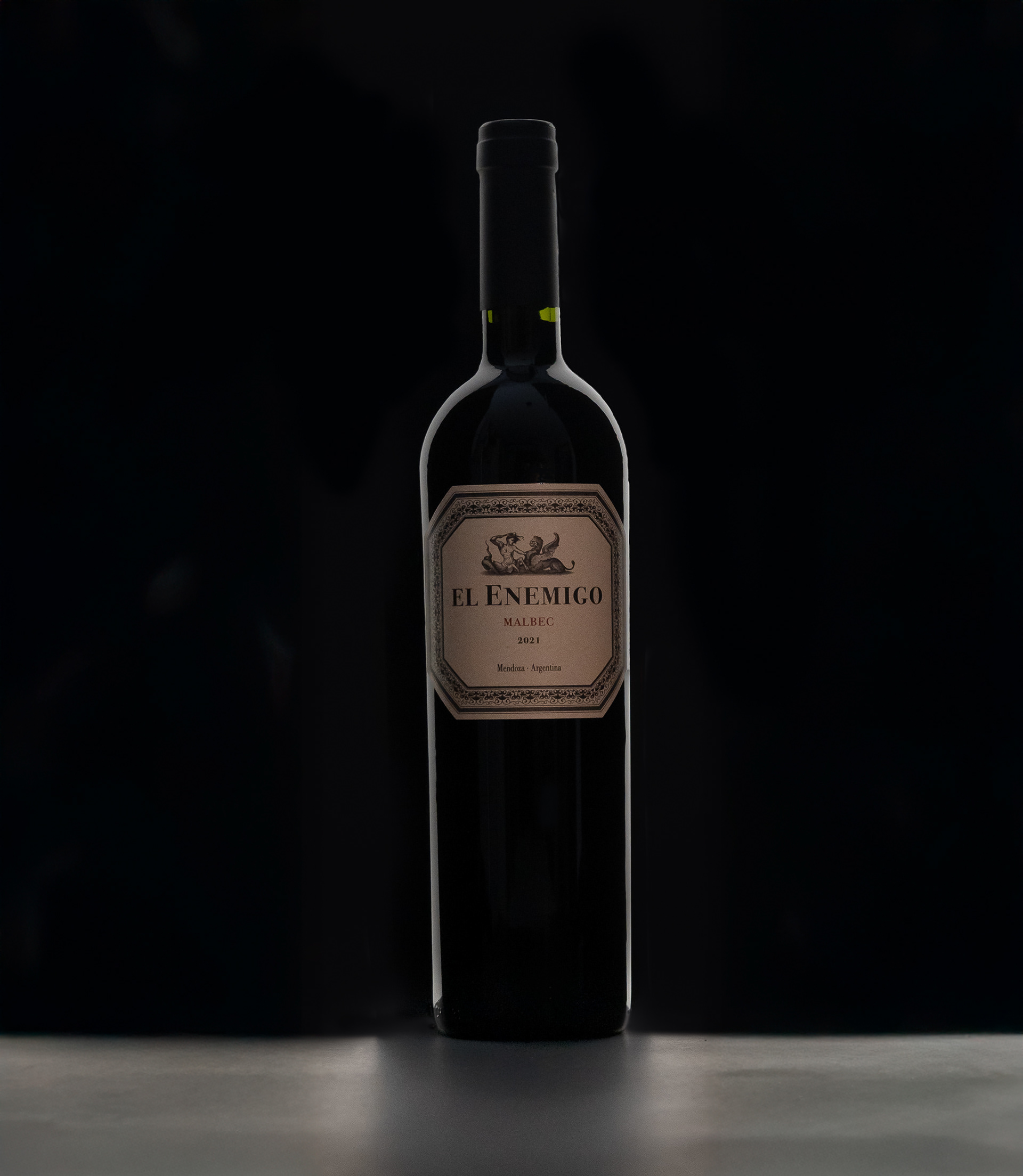 Professional wine product photography featuring El Enemigo Malbec. This minimalist shot uses elegant rim lighting to define the bottle silhouette against a deep black background, highlighting the intricate label detail for luxury beverage branding and catalog design.